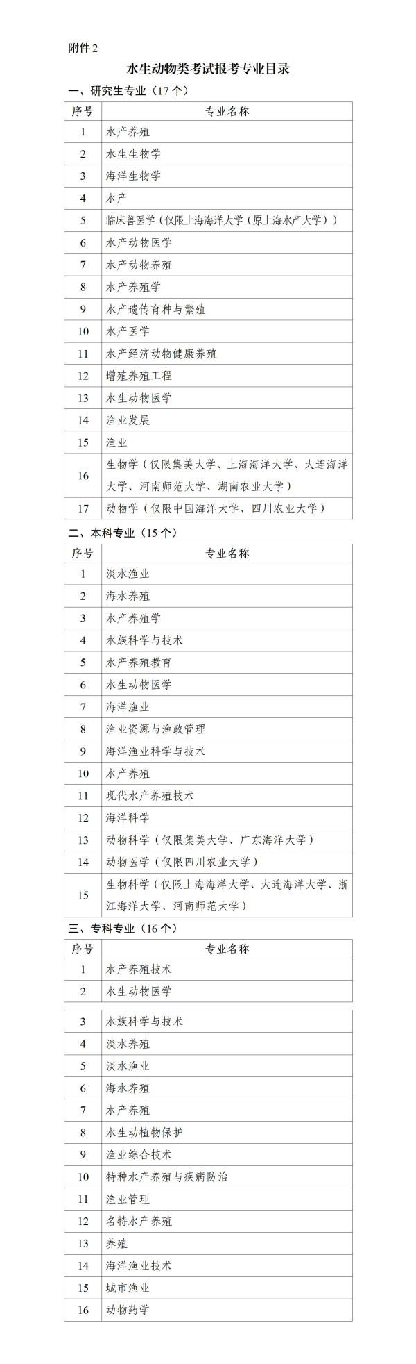 (二)具有大学专科以上学历的人员或全日制高校在校生,专业符合水生动物类考试报考专业目录(附件2)的,可以报名参加水生动物类考试。
