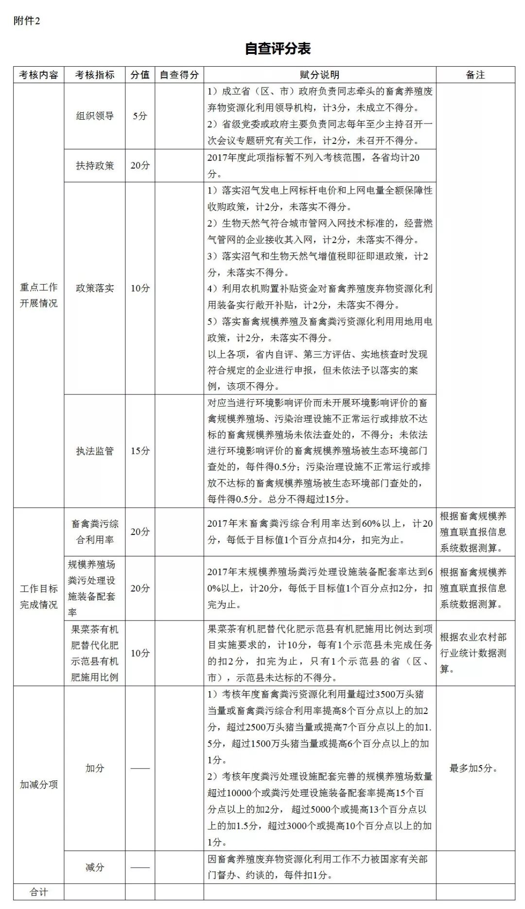 2017年度畜禽养殖废弃物资源化利用工作考核实施方案 为贯彻落实《国务院办公厅关于加快推进畜禽养殖废弃物资源化利用的意见》(国办发〔2017〕48号)(以下简称《意见》),按照《畜禽规模养殖污染防治条例》和《畜禽养殖废弃物资源化利用工作考核办法(试行)》(农牧发〔2018〕4号)(以下简称《考核办法》)要求,切实做好2017年度畜禽粪污资源化利用考核工作,制定本方案。 一、考核目的 根据《意见》确定的工作目标和重点任务,坚持目标导向、问题导向和结果导向,遵循客观公正、突出重点、综合评价、注重实效的原则,对畜禽粪污资源化利用工作开展情况与工作目标进行综合评价,深入查找突出问题和薄弱环节,进一步落实省级政府属地管理责任,切实推进畜禽粪污资源化利用工作。 二、考核对象 各省(区、市)人民政府,新疆生产建设兵团。 三、考核内容 按照《考核办法》,重点考核4个方面内容11项指标。 四、考核组织 考核工作由农业农村部、生态环境部负责组织,具体工作由农业农村部牵头。农业农村部畜禽粪污资源化利用办公室承担考核日常工作,农业农村部畜禽粪污资源化利用领导小组成员单位参加,生态环境部有关司局和单位参加。 五、考核步骤及要求 (一)自查评分 各省(区、市)人民政府按照考核要求,对畜禽粪污资源化利用情况进行全面自查和自评打分,于2018年7月31日前将年度自查报告报送农业农村部和生态环境部。自查报告按照“自查报告大纲”编写,报告章节要求内容完整,不缺项漏项。自查报告与证明材料请通过畜禽规模养殖场直联直报信息系统上传。 (二)实地检查 2018年6月,农业农村部印发开展实地检查的通知,农业农村部和生态环境部组成考核工作组,选择10个省(区、市)进行实地检查。考核工作组分为5组,分别由农业农村部科技教育司、种植业司、畜牧业司、全国畜牧总站、农业生态与资源保护总站1名司局级领导任组长,分别抽调1名处级以下干部参加,农业农村部畜禽粪污资源化利用办公室抽调5人参加,生态环境部有关司局和单位抽调5人参加。考核工作组通过听取汇报、查阅资料、现场检查等方式,全面核实了解有关情况,督促进度、检查问题、了解困难、总结经验,并形成书面报告(2018年7月底前完成)。 (三)第三方评估 农业农村部根据政府采购有关要求确定第三方评估机构,重点对31个省(区、市)和新疆生产建设兵团规模养殖场粪污处理设施装备配套率进行实地考察评估。第三方评估机构组织相关领域专家独立开展工作,31个省(区、市)和新疆生产建设兵团畜牧大县数量10个以上的按照10%抽取,不足10个的至少抽取1个大县进行评估(西藏自治区选择1个养殖量较大的县),每个县从畜禽规模养殖场直联直报信息系统中随机抽取20家规模养殖场,详细核查畜禽粪污资源化利用和粪污处理设施装备建设情况,必要时延伸到第三方处理机构和粪肥还田利用环节,推算调查评估县畜禽粪污综合利用率和规模养殖场粪污处理设施装备配套率(2018年7月底前完成)。 (四)综合评价 根据日常监督检查、实地检查、第三方评估和自查评分情况,农业农村部畜禽粪污资源化利用办公室、生态环境部水环境管理司联合对各省(区、市)和新疆生产建设兵团进行综合评价,提出考核等次建议,起草考核报告,于2018年8月底前联合报告国务院。考虑到2017年是畜禽粪污资源化利用工作全面启动实施的第一年,考核评价将根据各地工作总体情况,在《考核办法》的基础上进行调整。 六、考核结果运用 考核结果由农业农村部、生态环境部向各省(区、市)人民政府通报,向社会公开。对未通过年度考核的省(区、市),农业农村部会同生态环境部约谈省(区、市)人民政府及其相关部门有关负责人,提出整改意见。 七、工作要求 (一)加强组织领导 各省级政府要高度重视,把考核作为解决问题、推动工作的重要抓手,切实加强统筹协调,层层传导压力,全面落实地方政府属地管理责任。要合理安排工作进度,组织农业农村、生态环境等有关部门抓好落实,确保考核数据客观和真实,按要求提交自查报告。各地在开展考核工作中的问题和建议,及时向农业农村部、生态环境部反馈。 (二)认真做好准备 各地要认真组织开展调查摸底,摸清本地规模养殖场和散养户畜禽粪污资源化利用情况,及时通过畜禽规模养殖场直联直报信息系统填报。要全面总结工作,实事求是提供有关情况,深入查找问题并切实整改,进一步推动畜禽粪污资源化利用工作。对粪便污水贮存、处理、利用设施合格的规模养殖场,要及时将验收合格证明上传至畜禽规模养殖场直联直报信息系统,作为核定规模养殖场粪污处理设施装备配套率的重要依据。 (三)严守工作纪律 参加考核工作的人员要严格遵守中央八项规定精神和廉洁自律相关规定,遵守工作纪律,坚持求真务实、严谨细致、客观公正,敢于较真碰硬、严格把关,树立党员干部的良好形象。要做好保密工作,考核过程、结果等资料均为内部资料,应予以妥善保管,如出现泄密情况,要对相关人员严格追责。 附件: 1.畜禽粪污资源化利用工作考核自查报告提纲 2.自查评分表