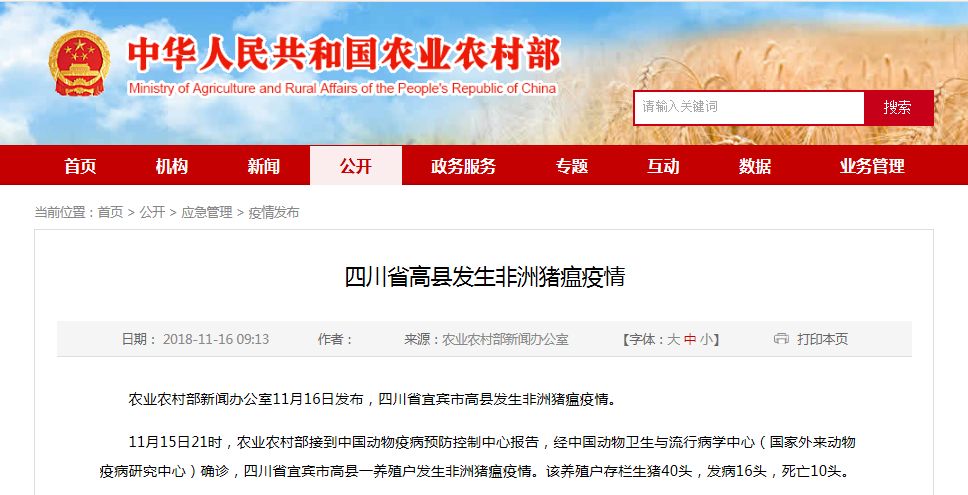 农业农村部新闻办公室11月16日发布,四川省宜宾市高县发生非洲猪瘟疫情。