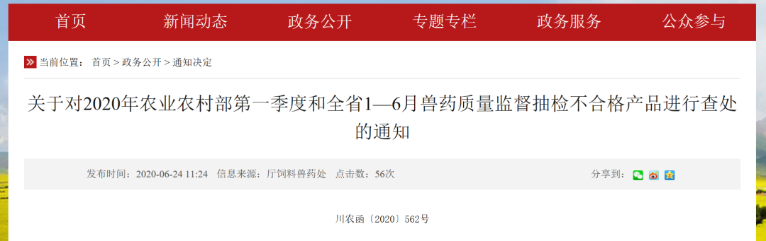 6月24日,四川省农业农村厅官网发布关于对2020年农业农村部第一季度和全省1—6月兽药质量监督抽检不合格产品进行查处的通知。