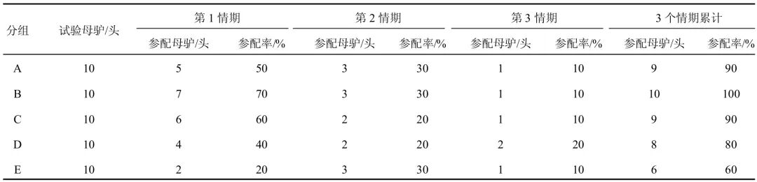 试验于2021 年4 月—2022 年8 月在金昌市某凉州驴养殖场进行试验。选择24~120 月龄舍饲养殖的50 头体况较好、体重175~260kg、生殖机能正常、未受孕的母驴。将50 头母驴随机分为5 个组,A~E 组每组10 头。A、B、C、D组为试验组,各组均用激素处理;E 组为对照组,不做激素处理。试验期间所有母驴以正常标准饲养,严禁与公驴混养。试验A 组第0 天注射促性腺激素释放激素,第7 天注射前列腺素,第9 天注射促性腺激素释放激素;试验B 组第0 天注射促性腺激素释放激素,第7 天注射前列腺素,第9 天注射人绒毛膜促性腺激素;试验C 组第0 天注射促性腺激素释放激素,第7 天注射前列腺素,第9 天注射促黄体素释放激素;试验D 组第0 天注射促黄体素释放激素,第7 天注射前列腺素,第9 天注射促黄体素释放激素;试验E 组第0 天注射生理盐水,第7 天注射生理盐水,第9天注射生理盐水。第9 天开始对各试验组发情母驴进行自然配种。一个发情周期结束后,对各组未发情母驴再以各组确定的激素处理方案进行一轮处理,各组未发情母驴按确定方案最多重复3个发情周期。具体分组及激素处理方案见表1。