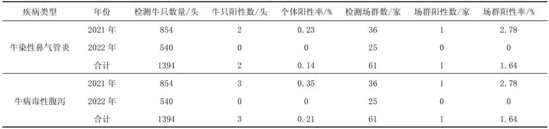 通过连续2 年分别对昆明市36 家、25 家肉牛规模养殖场进行牛传染性鼻气管炎和牛病毒性腹泻病原学调查,结果如表1 所示:①2021 年,牛传染性鼻气管炎病毒核酸阳性牛2 头,均为2岁左右的母牛,个体阳性率0.23%;阳性个体均来自同一规模养殖场,该场规模在300 头左右,场群阳性率2.78%。牛病毒性腹泻病毒核酸阳性牛3 头,个体阳性率0.35%;阳性个体均来自同一规模养殖场,该场规模在200 头左右,场群阳性率2.78%。②在对2021 年两个阳性场点持续进行监测的基础上,2022 年又筛选确定了23 家规模养殖场,统一组织开展牛传染性鼻气管炎病毒和牛病毒性腹泻病毒核酸检测,结果全部为阴性。总的来看,2 年间昆明市牛传染性鼻气管炎病毒核酸平均个体阳性率0.14%,平均场群阳性率1.64%;牛病毒性腹泻病毒核酸平均个体阳性率0.21%,平均场群阳性率1.64%。