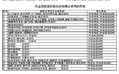 玉米赤霉醇、去甲雄三烯醇酮、醋酸甲孕酮及制剂所有用途、所有食品动物4氯霉素及其盐、酯(包括:琥珀氯霉素、及制剂所有用途、所有食品动物5氯苯砜及制剂所有用途、所有食品动物6硝基呋喃类:呋喃唑酮、呋喃它酮、呋喃苯烯酸钠及制剂所有用途、所有食品动物7硝基化合物:硝基酚钠、硝呋烯腙及制剂所有用途、所有食品动物8催眠、镇静类:安眠酮及制剂所有用途、所有食品动物9林丹(丙体六六六、杀虫剂水生食品动物10毒杀芬(氯化烯、杀虫剂水生食品动物11呋喃丹(克百威、杀虫剂水生食品动物12杀虫脒杀虫剂水生食品动物13双甲脒杀虫剂水生食品动物14酒石酸锑钾杀虫剂水生食品动物15锥虫胂胺杀虫剂水生食品动物16孔雀石绿杀虫剂水生食品动物17五氯酚酸钠抗菌杀虫剂水生食品动物18各种汞制剂包括:氯化亚汞、硝酸亚汞、醋酸汞、吡啶基醋酸汞杀虫剂动物19。