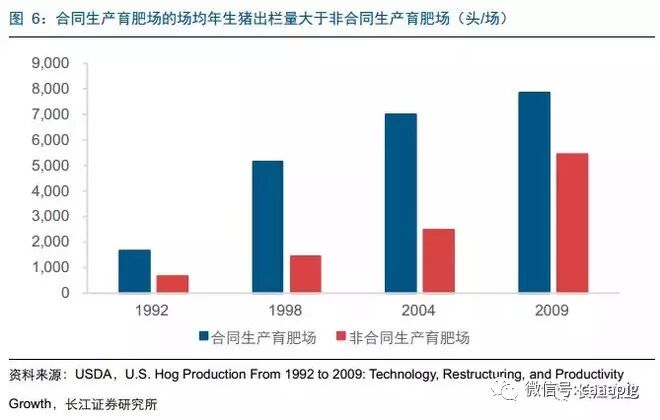 合同生产有利于猪场的快速规模扩张。1992年美国采用合同生产的育肥场年均生猪出栏量较自繁自养模式多1000多头,而2004年这一差距扩大到4500头。合同生产的规模优势使得其占比不断提升,1999年采用合同生产的猪场和生猪出栏量仅占全部猪场和出栏量的3%和5%,到2009年占比涨至48%和71%。