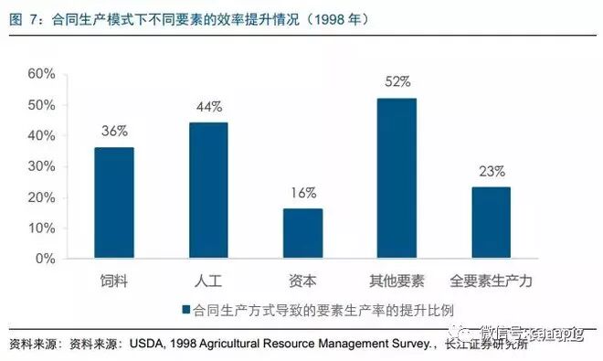 美国生猪合同生产方式的核心竞争力是低成本。根据Economic Research Service/USDA的调研和测算,1998年美国合同养殖的仔猪完全成本为75.05美元/美担,较自养模式的92.18美元/美担低18.58%;合同养殖的育肥猪完全成本为44.25美元/美担,较自养模式的51.60美元/美担低14.24%。1998年合同生产方式下的全要素生产力较自养模式高23%。合同生产的高效率一方面源于规模经济,另一方面充分发挥公司和委托农户在不同环节和要素上的优势。
