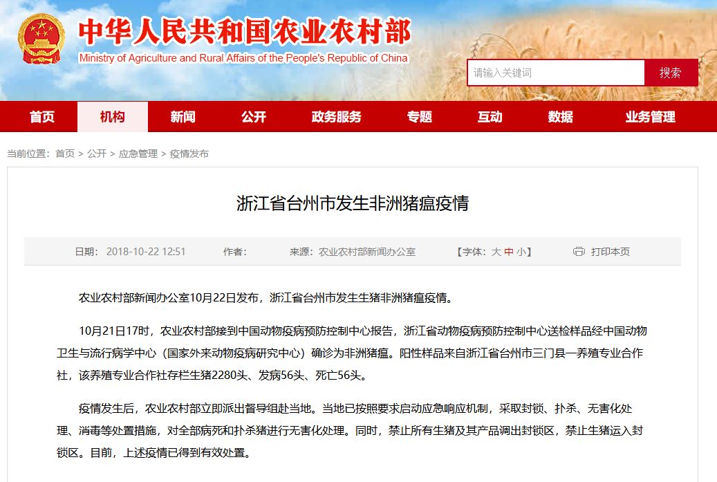 农业农村部新闻办公室10月22日发布,浙江省台州市发生生猪非洲猪瘟疫情,云南失守,浙江再发生疫情,封锁线轰塌,南方告急。