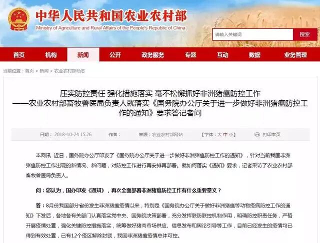 8月份我国部分省份发生非洲猪瘟疫情以来,目前已经发生的疫情均已得到有效处置,已有12个疫区解除封锁,我国非洲猪瘟疫情总体可控。