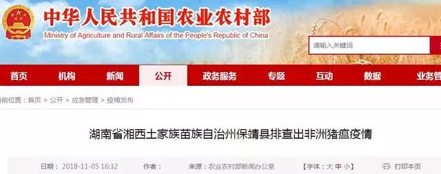 农业农村部新闻办公室11月5日发布,湖南省湘西土家族苗族自治州保靖县排查出非洲猪瘟疫情。
