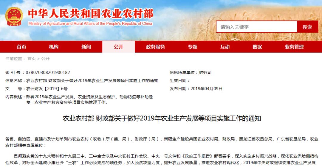 农业农村部4月9日消息,农业农村部、财政部发布关于做好2019年农业生产发展等项目实施工作的通知。通知提出,2019年中央财政继续安排农业生产发展资金、农业资源及生态保护补助资金、动物防疫等补助经费、农业生产救灾资金,进一步夯实粮食生产能力和农业基础,调整优化农业结构,加大农业资源生态保护,强化农业风险防范,加快培育农村发展新动能。