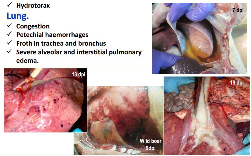 表现严重的肺水肿,同时为充血性脾肿大,可能达正常的六倍,边缘为原型,同时易碎,呈现为黑紫色(图41A);淋巴结,主要是胃肝和肾淋巴结上面有出血(图41C),呈现大理石花斑(图41C);肾脏皮质和肾盂中通常出现出血瘀点(图41D)。其他非典型病理变化还包括膀胱、心内膜、心外膜和胸膜有出血瘀点。