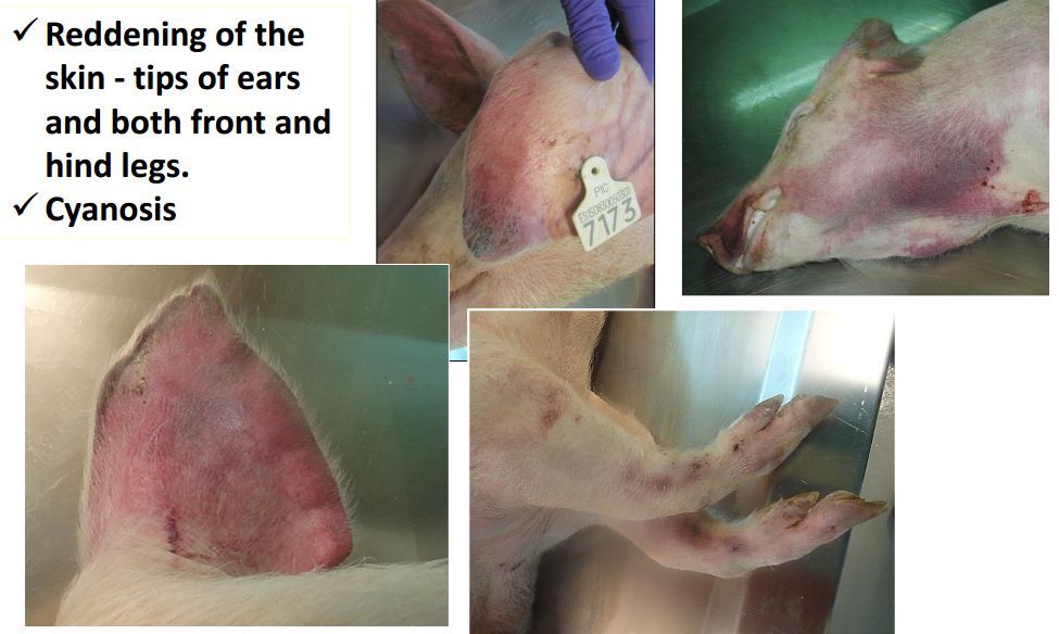 皮肤表面坏死,耳、胸、腹、前、后腿皮下血肿