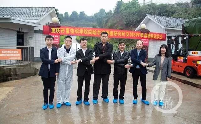 哈尔滨兽医研究所试验动物基地副主任王振龙,重庆市畜牧科学院副院长黄勇、生物工程研究所所长葛良鹏,荣昌区畜牧兽医局副局长赵敏、荣昌区动物卫生监督所负责人谢泽峰参与并见证了启运仪式。