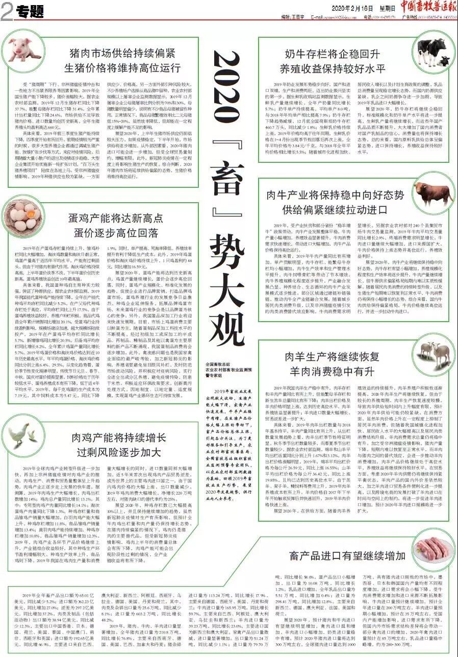 具体来看,我国蛋种鸡自主育种实力较强,保证了种源供应。据农业农村部监测,2019年我国祖代蛋种鸡产能持续下降,全年在产祖代种鸡平均存栏同比减少5.2%,在产父母代种鸡存栏处于高位,平均存栏同比上升17.5%,由于蛋鸡养殖效益较好,养殖户补栏积极,商品代鸡苗全年累计销售同比增加20.1%。受蛋鸡行业持续盈利影响,规模场建设加速,超大规模场陆续投产。2019年在产蛋鸡平均存栏同比增长5.7%,新增雏鸡同比增长20.5%,后备鸡平均存栏同比增长8.2%,全年累计鸡蛋产量同比增长5.7%。2019年鸡蛋价格和淘汰鸡价格达到近10年历史最高水平,年平均鸡蛋价格、淘汰鸡价格同比分别上涨6.4%、29.5%。从变化趋势看,蛋价季节性变化规律明显,传统节日元旦、春节、中秋、国庆对蛋价提振显著。饲料价格处于历年较低水平,蛋鸡养殖成本有所下降,低于近4年平均水平。2019年,每千克鸡蛋的生产成本为7.19元,其中饲料成本为5.47元,同比下降1.9%。同时,单产提高、死淘率降低、养殖效率提升有利于降低生产成本。此外,2019年鸡蛋价格和淘汰鸡价格持续上升,只鸡盈利约44元,同比增加16.59元。展望2020年,蛋鸡产能将达到历史新高点,鸡蛋产量继续增长,蛋价会逐步高位回落。同时,蛋鸡产业规模化、标准化发展的趋势,促使企业进行品牌营销,打造品牌鸡蛋市场。蛋鸡养殖行业的发展竞争日益激烈,种鸡企业延伸服务,拓展品牌鸡蛋市场,未来蛋鸡行业的竞争会是以品牌蛋为核心的竞争。另外,我国蛋品深加工行业将迎来快速发展期。目前,市场上鸡蛋消费主要以鲜蛋为主,随着蛋制品深加工科技水平的不断提高,经过初级加工或深加工的半成品、再制品、精制品及其他以禽蛋为主要原料的新产品不断涌现,我国蛋制品消费将会逐步增加。此外,禽流感问题也是我国家禽业面临的最严峻考验,加之新冠肺炎的影响,养殖者要避免盲目跟风补栏,及时防范市场波动风险,并积极应对疫病风险,实行全进全出或分区养殖,避免疫情传染,防患于未然。积极适应环保政策要求,创新粪污处理方式,因地制宜、以地定量、适度规模,实现蛋鸡产业循环生态可持续发展。2019年全球肉鸡产业转型升级进一步加快,再加上非洲猪瘟疫情对肉鸡产业的推动,肉鸡生产、消费和贸易量整体呈上升趋势,肉鸡产业正逐步走上发展的快车道。据测算,2019年肉鸡生产大幅增长,肉鸡出栏数增加14%;鸡肉总产量同比增长13.1%。其中:专用型肉鸡产肉量同比增长14.1%;淘汰蛋鸡产肉量同比下降1.3%。种鸡存栏量和商品雏鸡产销量大幅增加。白羽肉鸡产能大幅上升,种鸡存栏增加11.8%,商品雏鸡产销量增加13.4%;黄羽肉鸡产能持续增加,种鸡存栏增加10.8%,商品雏鸡产销量增加12.3%。2019年,肉鸡产业各环节产品价格继续上升,产业链综合收益较好,其中种鸡生产环节盈利增幅较大。种鸡生产效率上升,商品鸡则下降。2019年我国在鸡肉生产量和消费量大幅增长的同时,进口数量同样大幅增加,近5年来首次出现鸡肉产品贸易逆差,成为世界上的主要鸡肉进口国之一,由于国内鸡肉价格的大幅上涨,出口数量减少。2019年鸡肉消费大幅增长,净增长220万吨左右,对猪肉缺口的替代率约为25%。展望2020年,种鸡存栏数已大幅提高10%以上,并且保持继续增加的趋势,虽然新冠肺炎疫情对生产有所影响,但预计全年肉鸡出栏量和肉产量仍保持增长态势。在猪肉持续偏紧的情况下,鸡肉仍是猪肉的主要替代品,但受新冠肺炎疫情影响,鸡肉上半年的消费量总体会有所下降,肉鸡产能可能会出现阶段性过剩的情况,全产业链收益将有所下降。2019年奶业发展形势稳步向好,国产和进口双增,生产和消费两旺,迈出奶业振兴坚实的第一步。据生鲜乳收购站监测数据显示,生鲜乳产量继续增长,全年产奶量同比增长5.7%;奶牛单产持续提高,平均单产8.0吨,与2018年年均单产相比提高7.9%;奶牛存栏下降趋势减缓,12月底全国荷斯坦奶牛存栏460.7万头,同比减少1.8%;生鲜乳价格持续上涨,2019年价格均高于往年同期,生鲜乳价格在1~4月份出现季节性回落后再次上涨,全年平均价格为3.84元/千克,与2018年全年平均价格相比增长5.5%;随着城市化进程加快、居民收入增长以及计划生育政策的调整,乳品总消费量呈现稳定增长态势,而国内奶源供应紧缺,乳企之间奶源争夺进一步加剧,导致2019年乳品进口大幅增长。展望2020年,奶牛存栏将继续企稳回升,标准规模化和奶牛单产水平将进一步提高,生鲜乳产量将继续增长。而近些年国产乳品品质不断提升,大大增加了国内消费者对国产乳制品的信心,消费量也将保持增长态势。总的来看,国内原料乳供给总体呈偏紧态势,进口保持增长,养殖收益保持较好水平。2019年,受产业扶贫和部分省份“稳羊增牛”政策带动,肉牛产业发展整体平稳,牛肉产量小幅增加,养殖效益显著提升,牛肉消费需求快速增长,带动进口大幅增加,肉牛产品价格保持高位运行。具体来看,2019年牛肉产量同比有所增加,单产贡献明显,肉牛存栏、能繁母牛存栏均小幅增加。肉牛生产效率和生产管理水平提升,肉牛饲喂青贮等带动了节本增效。肉牛养殖规模化程度逐步提升,产业融合发展凸显,种养结合、生态循环的肉牛产业发展模式逐步推进。部分区域通过建链补链强链,推动肉牛全产业链融合发展。随着城乡居民肉类消费升级,以及非洲猪瘟疫情引发的肉类消费替代效应影响,牛肉消费需求明显增长