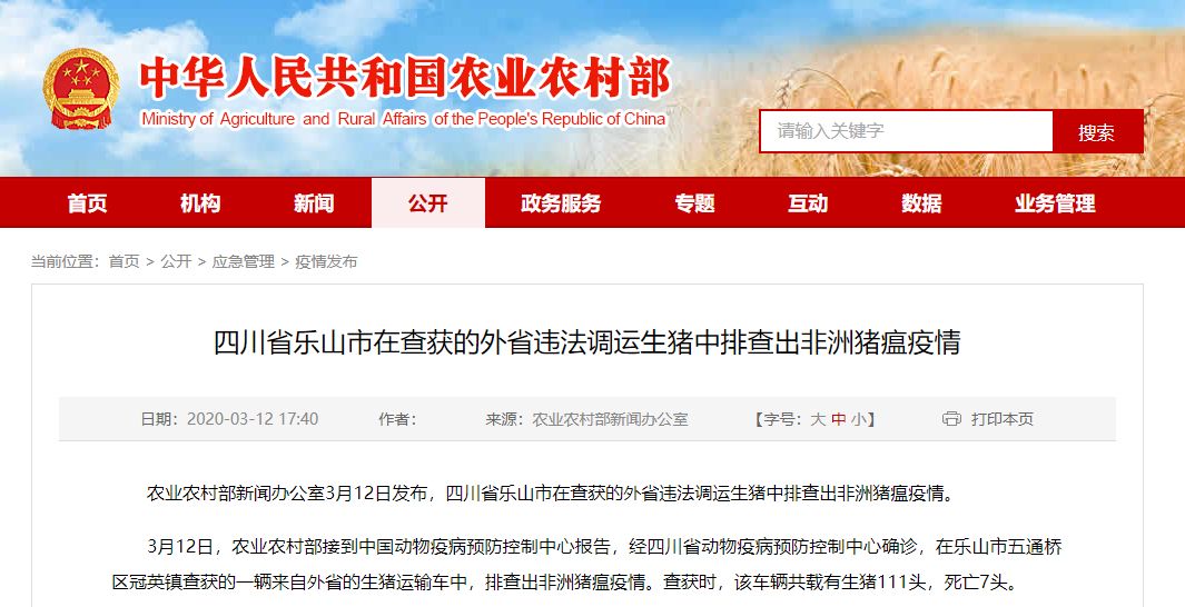 3月12日,农业农村部接到中国动物疫病预防控制中心报告,经四川省动物疫病预防控制中心确诊,在乐山市五通桥区冠英镇查获的一辆来自外省的生猪运输车中,排查出非洲猪瘟疫情。查获时,该车辆共载有生猪111头,死亡7头。