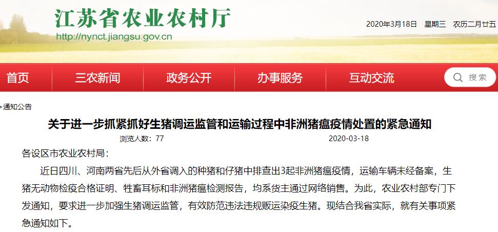 日前,江苏省农业农村厅发布《关于进一步抓紧抓好生猪调运监管和运输过程中非洲猪瘟疫情处置的紧急通知》,通知指出,近日四川、河南两省先后从外省调入的种猪和仔猪中排查出3起非洲猪瘟疫情,运输车辆未经备案,生猪无动物检疫合格证明、牲畜耳标和非洲猪瘟检测报告,均系货主通过网络销售。农业农村部专门下发通知,要求进一步加强生猪调运监管,有效防范违法违规贩运染疫生猪。通知从六个方面要求进一步抓紧抓好生猪调运监管和运输过程中非洲猪瘟疫情处置。