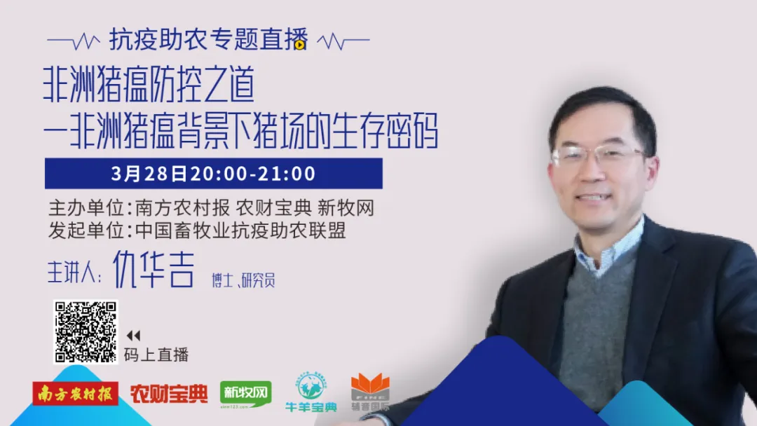 金猪时代,一头仔猪2000多元,一头肥猪利润甚至突破了2600元,如果防不住非洲猪瘟,则意味着与这场盛宴无缘。进一步升级防非技术体系,掌握更多科学防控策略成为猪场的第一要务。有问题不要怕,由南方农村报农财宝典新牧网主办的抗疫助农专题直播为养猪业的朋友答疑解惑,本期直播特别邀请到中国农业科学院哈尔滨兽医研究所仇华吉研究员,为大家介绍非洲猪瘟防控之道——非洲猪瘟背景下猪场的生存“密码”。