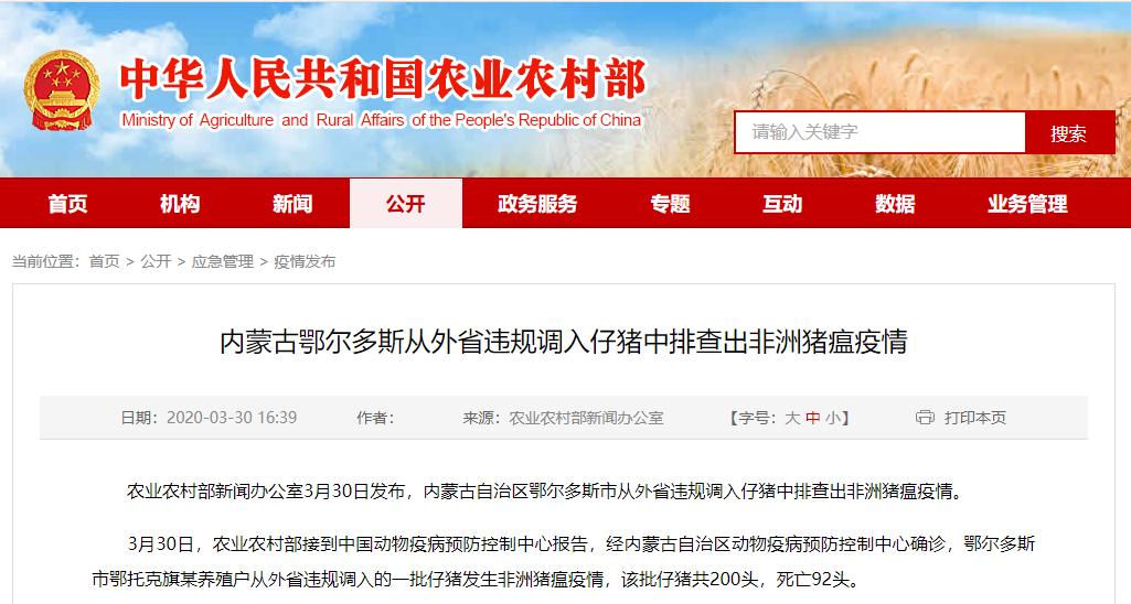农业农村部新闻办公室3月30日发布,内蒙古自治区鄂尔多斯市从外省违规调入仔猪中排查出非洲猪瘟疫情。 3月30日,农业农村部接到中国动物疫病预防控制中心报告,经内蒙古自治区动物疫病预防控制中心确诊,鄂尔多斯市鄂托克旗某养殖户从外省违规调入的一批仔猪发生非洲猪瘟疫情,该批仔猪共200头,死亡92头。