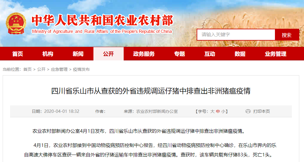 4月1日,农业农村部接到中国动物疫病预防控制中心报告,经四川省动物疫病预防控制中心确诊,在乐山市界内的乐自高速大佛停车区查获一辆来自外省的仔猪运输车中排查出非洲猪瘟疫情。查获时,该车辆共载有仔猪83头,死亡1头。疫情发生后,当地已按照要求启动应急响应机制,对所有仔猪进行无害化处理,并对相关处置地点、环境、道路及运输车辆等进行彻底消毒,案件已移交公安机关处理。目前,该批生猪已按规定处理完毕,疫情调查和追溯工作正在进行中。