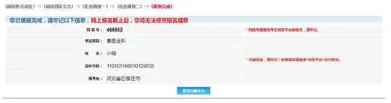 以上信息按要求填报完毕后,系统显示填报完成。报考人员应再次核对姓名、有效身份证件号码、报考地等重点信息是否正确,并牢记网报号和登录密码。