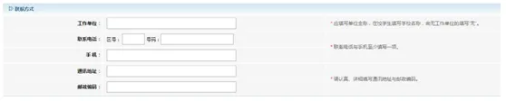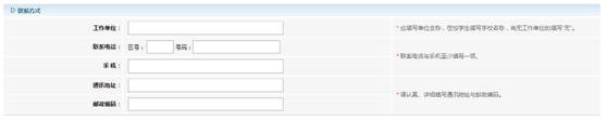 联系方式包括工作单位、联系电话、手机、通讯地址、邮政编码。联系方式变更的,可随时登录“自助平台”进行修改。其中:工作单位应填写全称,在校学生填写学校名称,离校且尚无工作单位的填写“无”。联系电话和手机号码应至少填写一个。