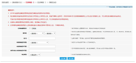 其中:报考地为现场确认、缴费和资格申请的地点,并且报考人员将在报考地所在省(区、市)参加考试。姓名应填写完整,姓名中的生僻字用“*”代替,姓名中间不要用空格或特殊符号隔开。有效身份证件包括第二代居民身份证、香港居民身份证、澳门居民身份证、台湾居民来往大陆通行证,所选证件为考试各环节唯一认可的有效证件,报考人员应准确填写有效身份证件号码。