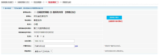 “信息填报二”中,报考人员需要填报详细的报名信息,包括:报考人员应阅读报考地公告,确认已经阅读并知晓公告内容。填报性别、出生日期、户籍所在地、职业类别,上传电子照片。报名截止后,填报信息不可更改。其中:户籍所在地,指户籍所在地区。职业类别,指报考人员报名时所从事的职业。包括兽医/水产工作机构、诊疗机构、动物饲养场、兽药生产经营、学生、科研教育和其他。兽医/水产工作机构包括兽医/水产行政、执法监督、技术支撑等三类兽医/水产工作机构;诊疗机构包括动物诊所、动物医院;动物饲养场包括养殖场、养殖小区、动物园;兽药生产经营包括兽药、饲料生产经营企业;科研教育包括大学、院校、科研院所。电子照片应为近期、正面、彩色免冠证件照,照片底色为白色或蓝色,jpg 格式,电子照片长度与宽度比例在1.46:1 左右,高度不小于189 像素,建议尺寸为230 像素(宽度)×334 像素(高度),电子照片文件大小不小于20KB,且不超过40KB,保证照片清晰,不变形。