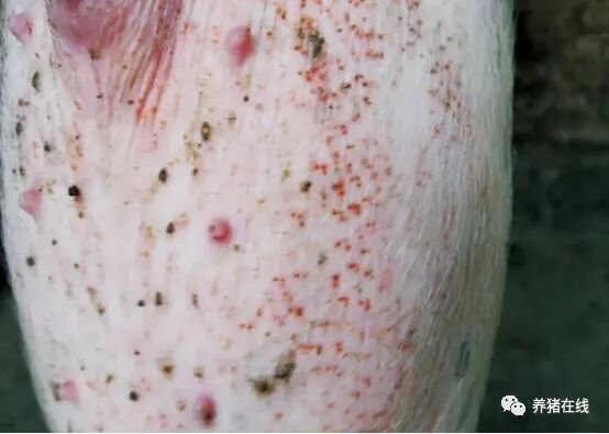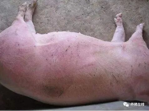 猪感染附红体后临床症状具有多样性,因外观与副猪嗜血杆菌、霉菌毒素蓄积中毒、蓝耳病、慢性非瘟相似,所以,在兽医临床上误诊率极高。(1)皮肤发红:易与非洲猪瘟相混淆,后者具有体温下降和高死亡率的特征。(2)皮肤发黄:易与副猪嗜血杆菌相混淆,后者具有体温稽留热和腹式呼吸的特征。(3)皮肤发白:易与圆环病毒和寄生虫病相混淆,圆环病毒多发于小猪,并有衰竭症状;与寄生虫病区别在于猪群周围土地面、无驱虫史,严重患猪有顾腹尖叫等腹痛症状。(4)毛孔渗血:易与毒素蓄积相混淆,后者体温正常或偏低。(5)眼窝或肛门黑青:易与蓝耳病相混淆,后者发病率高,并有反复发热的特征。(6)母猪莫名其妙体温下降:易与慢性非瘟相混淆,后者濒死前体温才下降。(1)患猪发肤发红和毛孔渗血,属发病早期阶段;皮肤发红的实质是动脉性充血,毛孔渗血的实质是血小板数量减少;附红体作为致炎因子,会引起神经轴索(神经元的轴突和树突统称为神经轴索)反射,使血管舒张神经兴奋;同时,附红体造成炎症部位释放组织胺、缓激肽等血管活性物质,双重作用使患猪细动脉扩张,致血液流入组织中的量增多而造成皮肤外观发红。血流中血小板减少无外乎血小板分布异常或血小板生成减少两种因素。前者是因为新生成的血小板约1/3先在脾脏储存,以后慢慢与血中的血小板自由交换,附红体引起患猪脾脏肿大,脾脏内储存血小板过道,导致血小板分布异常而使血流内血小板减少;后者是因为血小板由骨髓造血组织中的巨核细胞生成,某些药物(如安乃近)能够干扰DNA的合成,抑制细胞丝状分裂,造成骨髓增生低下和巨核细胞极度减少,进而导致全血细胞(包括血小板) 生成减少,所以,在临床上会见到患猪原本毛孔不渗血,用过退热药物以后,就毛孔渗血了。