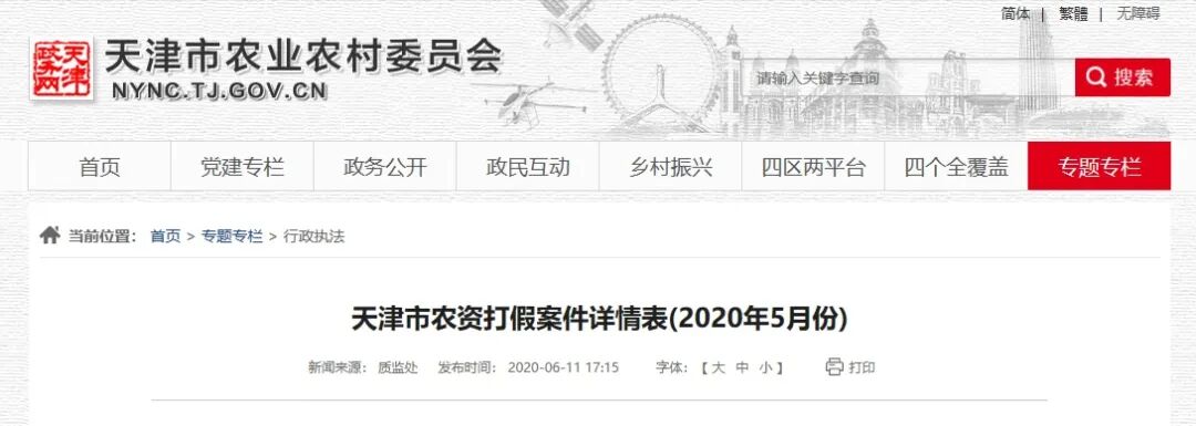6月11日,天津市农业农村委员会网站发布天津市农资打假案件详情表(2020年5月份),公开3起生产经营劣兽药案件信息。信息显示,执法人员对侯家营镇畜禽欢兽药店进行检查时发现,该门店货架里有超过有效期的兽药“苦参注射液”,经查过期兽药苦参注射液共计4盒,货值80元整。对邦均镇光亮兽药经营部进行检查时,发现该兽药经营部货架上有超过有效期的“双黄连口服液”,经查过期兽药“双黄连口服液”3瓶,值60元整。对天津恒基利得生物科技发展有限公司生产的三氯异氰尿酸粉、硫酸新霉素进行调查。经查,涉案产品含量不符合《兽药质量标准(2017年版)》,货值共计4334元。依据《兽药管理条例》第四十八条,认定涉案产品均为劣兽药。