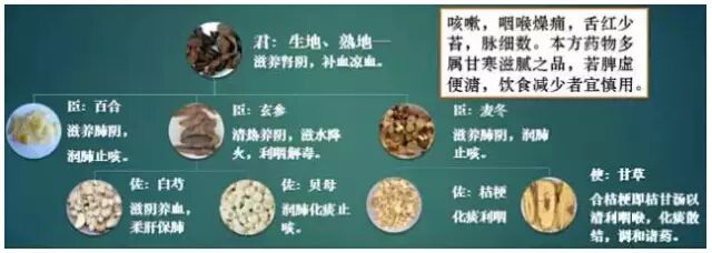 44:肺阴虚:1证:干咳连声、昼轻夜重、盗汗、口干舌燥、粪干、尿少色浓、口色红、舌无苔、脉细数、;2治:滋阴润肺;3方:百合固金汤。