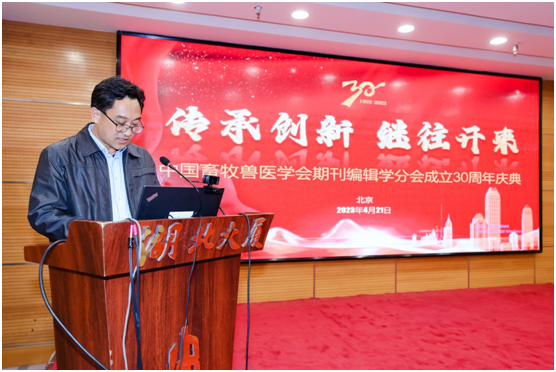 2023年4月21日中国畜牧兽医学会期刊编辑学分会(以下简称“分会”)成立30周年庆祝活动(原定于2022年召开的庆祝活动受疫情影响延期至此)在北京成功举办,同期召开了分会八届二次常务理事会暨媒体交流会。中国畜牧兽医学会名誉理事长阎汉平,中国畜牧兽医学会副秘书长李传业,中国畜牧兽医学会副秘书长石娟,中国农业科学院成果转化局副局长、全国农业科技成果转移服务中心主任、分会名誉理事长冯艳秋,江苏省家禽研究所研究员、《中国禽业导刊》总编和《中国家禽》副总编、分会资深顾问戴有理等领导、专家及代表莅临现场,分会会员期刊单位代表近70人参加此次庆祝活动。