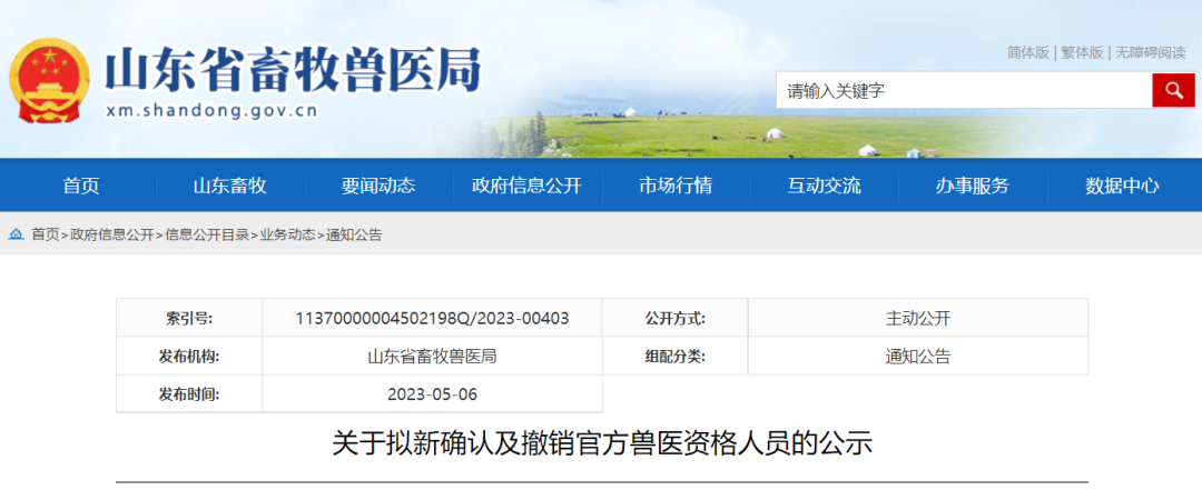 根据《山东省畜牧兽医系统官方兽医管理办法(试行)》和《山东省畜牧兽医局关于做好官方兽医资格清理确认工作的通知》(鲁牧动卫中心发〔2022〕15号)要求,省畜牧局组织人员对有关市申报确认和撤销的官方兽医人员资格材料进行了审核,确定拟新确认官方兽医资格17人,拟撤销官方兽医资格1人,并予以公示。公示期间,如有异议,请及时向省畜牧局反映。