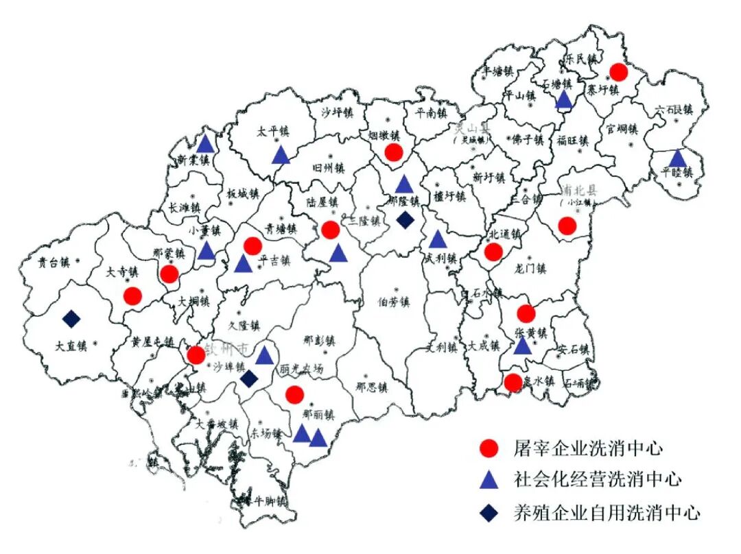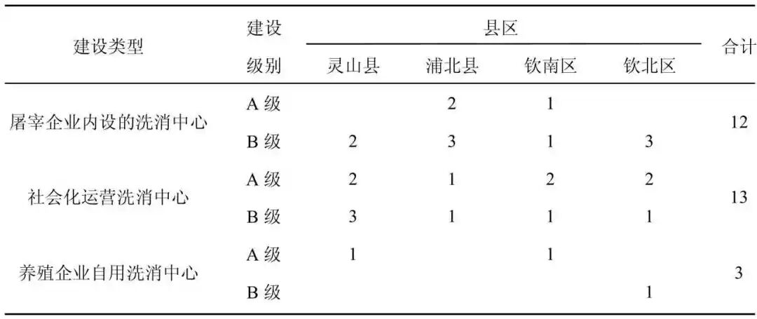 广西现存的洗消中心业态主要表现有四大类:养殖企业配套的一级(预清洗+烘干)、二级(精洗消+烘干+中转)洗消中心;屠宰企业内设的洗消中心;无害化处理厂内设的洗消中心;社会化运营的畜禽运输车辆洗消中心。目前钦州市屠宰企业内设的洗消中心有12 家;养殖企业自用洗消中心有3 家;社会化运营洗消中心有13 家。全市各县区各类型洗消中心建设级别数量如表1,各类型洗消中心在钦州市各乡镇的分布情况如图1。