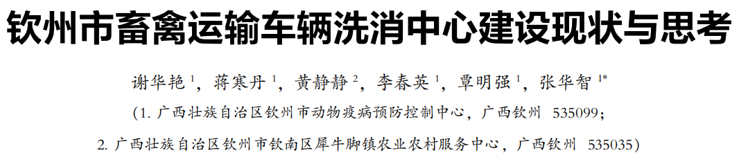 摘要:2019 年国务院办公厅发布《关于加强非洲猪瘟防控工作的意见》,明确指出“加强生猪及生猪产品调运管理”,为加快完成畜禽运输车辆洗消中心建设任务,钦州市经过2 年推进,钦州洗消中心建设取得良好成绩,为防止非洲猪瘟疫情的发生发挥了重要作用,降低了疫病发生的风险。但在目前洗消中心在建设标准、运行、监管、洗消效果评估等方面仍需总结经验,不断完善。该文通过探讨钦州市畜禽运输车辆洗消中心建设及运行现状,阐述洗消中心建设、运行、监管等难点,旨在为畜禽运输车辆洗消中心如何标准化的建设、高效的运行、全面的验收与监管提供理论参考。